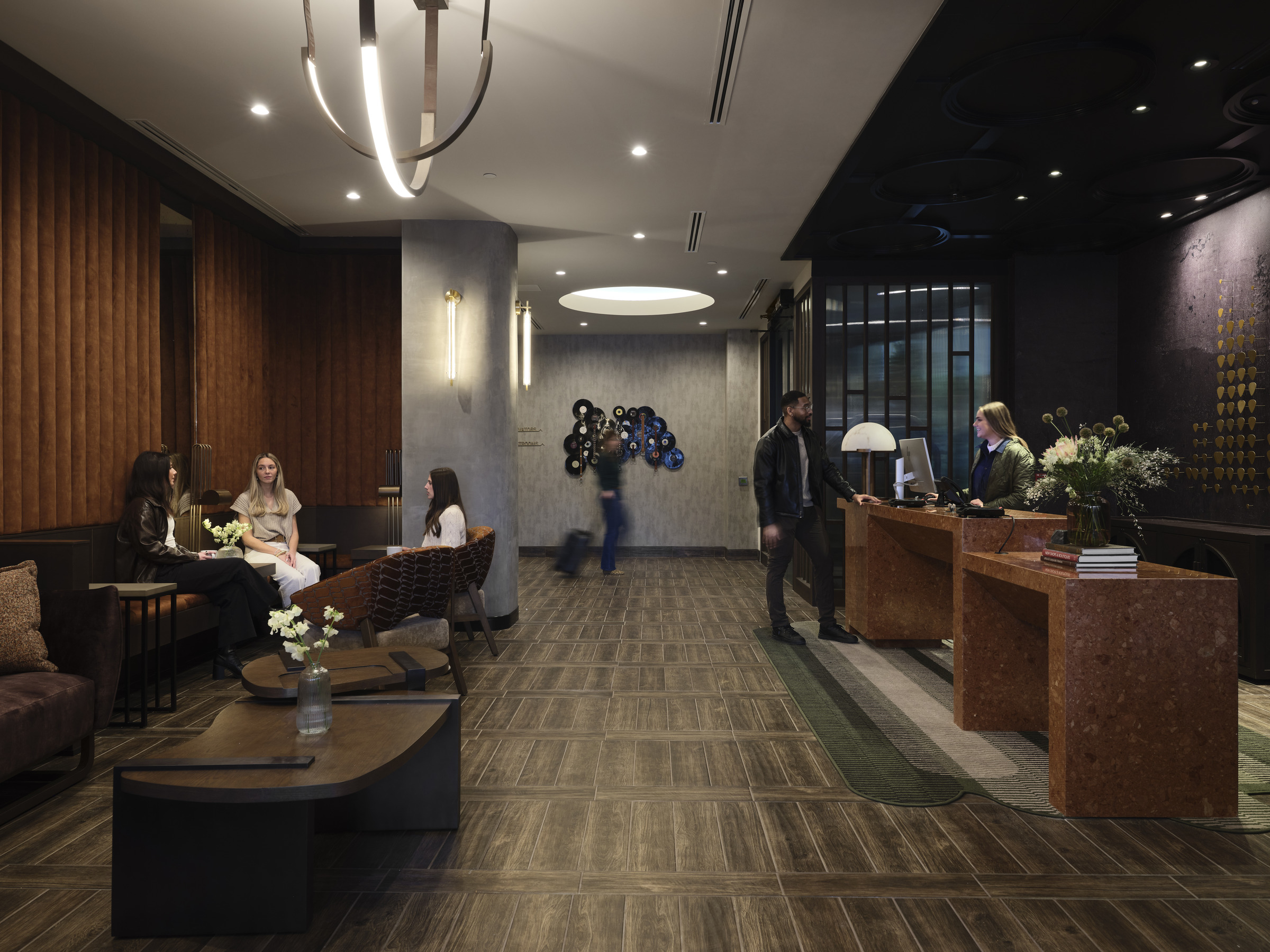 Unlike many urban hotels, the property offers two distinct entries. One draws guests through a lower-level restaurant along 3rd Avenue, while the other leads through a more secluded courtyard drop-off. Inside, a two-story lobby opens the space, anchored by a staircase that connects to a second-floor bar and patio.