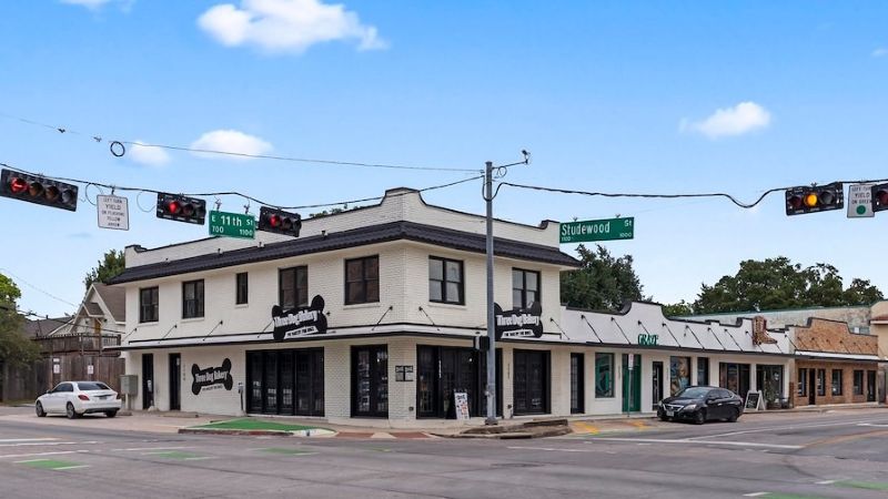 Located at 1129–1141 E 11th St., the property sits at the signalized intersection of East 11th Street and Studewood Street, with traffic counts exceeding 17,000 vehicles per day. Tenants include Three Dog Bakery and Republic Boot Co. The site benefits from strong area demographics, with an average household income exceeding $175,000 within a one-mile radius.